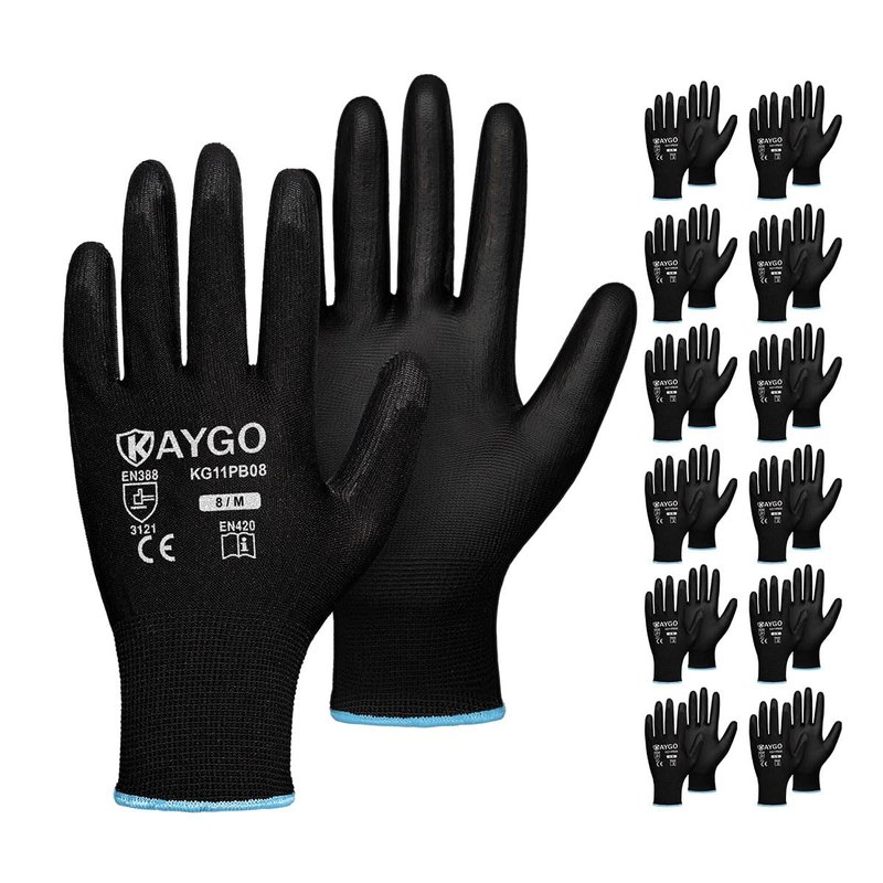 KAYGO Safety Work Gloves PU Coated-12 Pairs, KG11PB, Seamless Knit Glove with Polyurethane Coated Smooth Grip on Palm & Fingers, for Men and Women, Ideal for General Duty Work (Medium, Black)