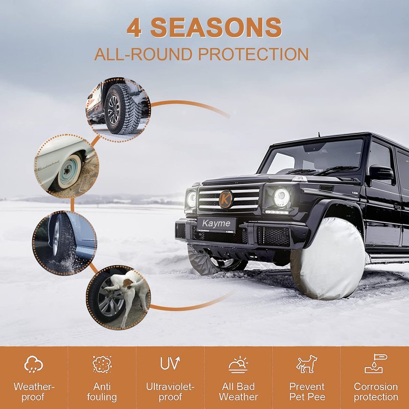 2) Kayme Tire Cover Made Of Four Layers Material, Waterproof, Durable, Provide Better Protection From Sun And Rain, Keep Wheels In Good Shape And Extend Service Life.