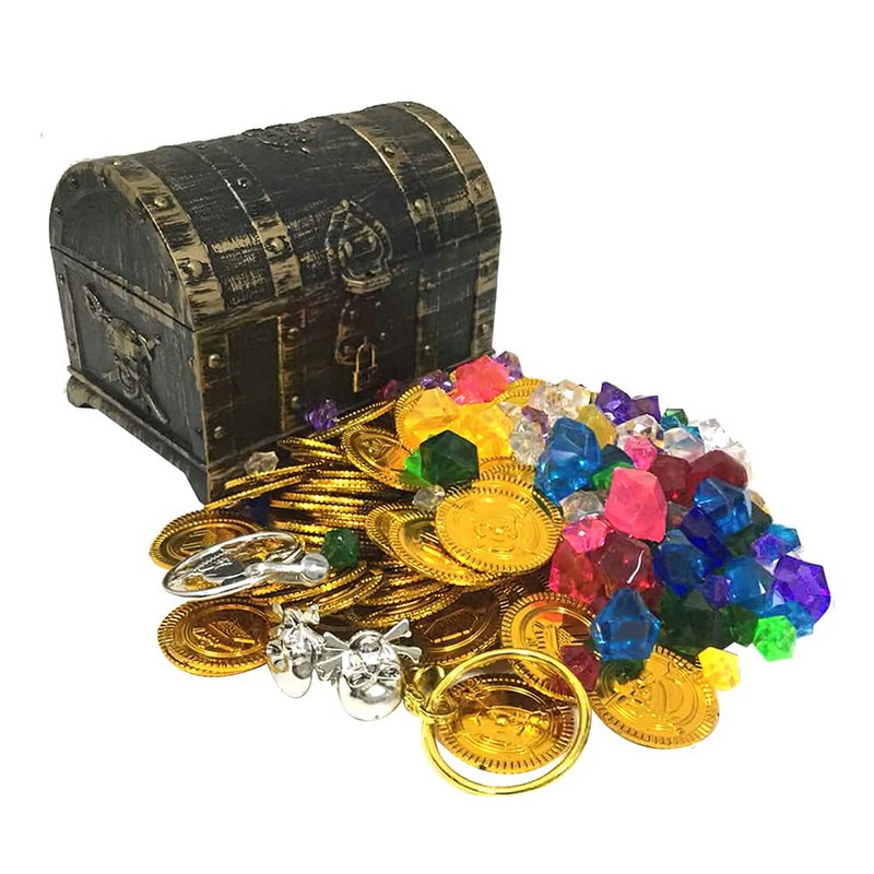 - 🎁172 Pcs Pirate Treasure Chest:This pirate treasure includes 1 Treasure Box,100 pirate gold cions,2 Earrings,2 Rings and 68 fake Colorful Gems(about weight 100 Gram).Diameter of each coin is about 1.36 inches.A nice combination for pirate themed party decoration,pretend play,etc.