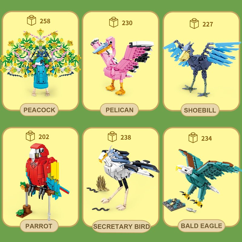 - Posable Bird Models:This KAZI bird toys building block set features 6 birds model for kids 8 years old and up:macaw parrot,peacock,secretary bird,bald eagle,pelicans and shoebill.The toy birds are richly colored and comes with jointed parts.