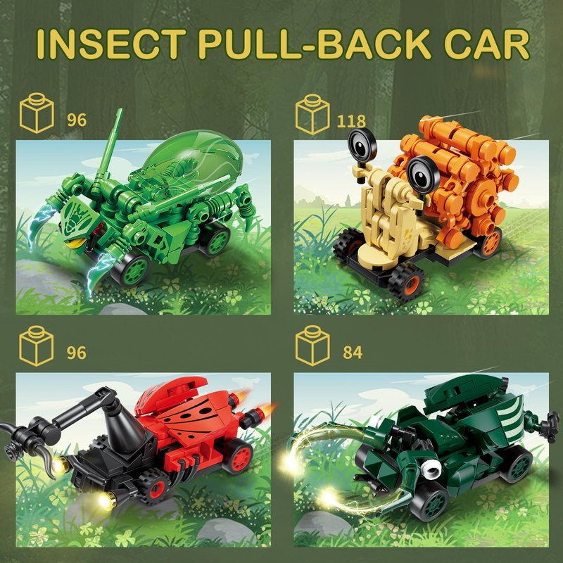 - Insect Pull Back Cars Toy : Our bugs building toy set featuring 8 pack insect pull back cars toy.The combination of Brick-build and pull-back car provides endless fun for boys ages 8-14.