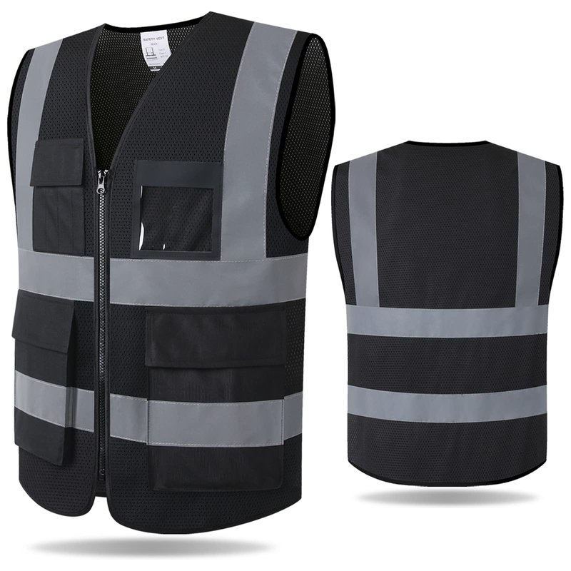 Kazsaifo Reflective Safety Vest for Men Women with 8 Pockets and Zipper High Visibility Mesh Construction Work Vest Meets ANSI/ISEA Standards (KZ170-Black, L)