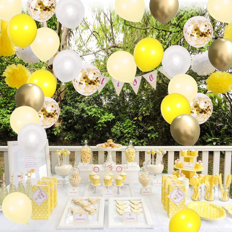 - 【What You Get】 - The Sunflower theme balloons set in 5 different types: Pastel Yellow, Yellow, White, Metallic Gold, Gold Confetti and 33 Ft Yellow Ribbon. Yellow Balloons that will fulfill your dream party set-up.