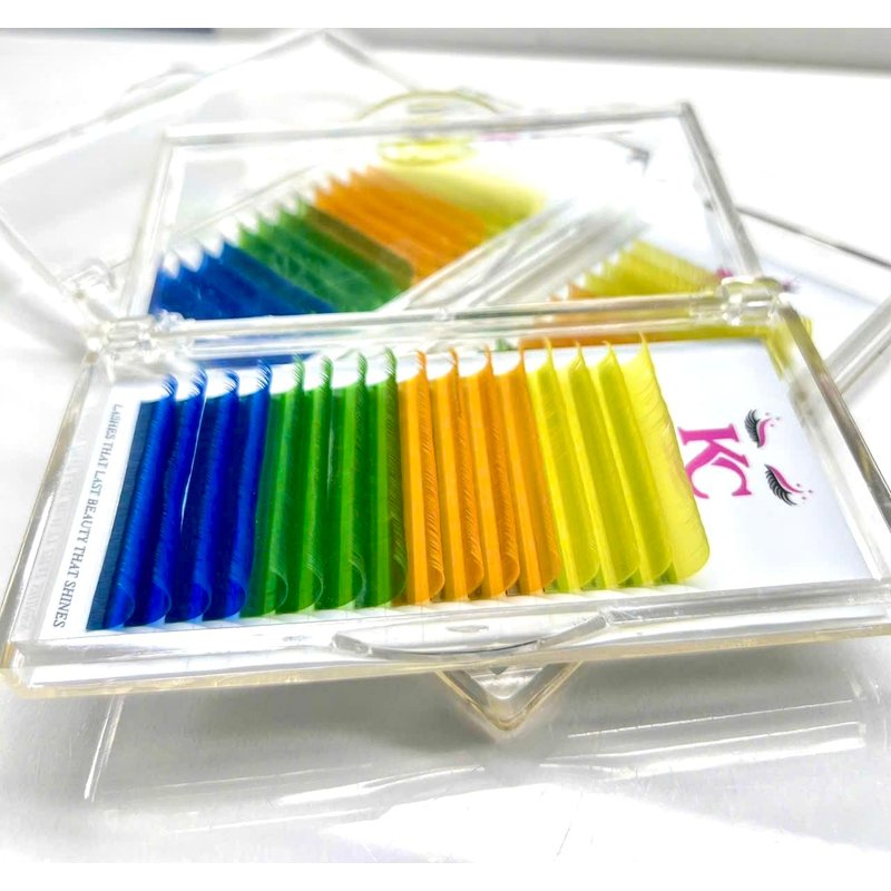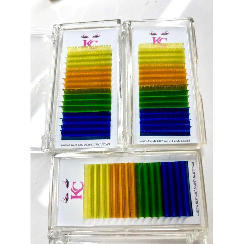 - KC Lashes eyelash extensions tray. Yellow, Orange, Blue, Green. Thickness 0.07, D curvature, length 11, 12, 13, 14mm