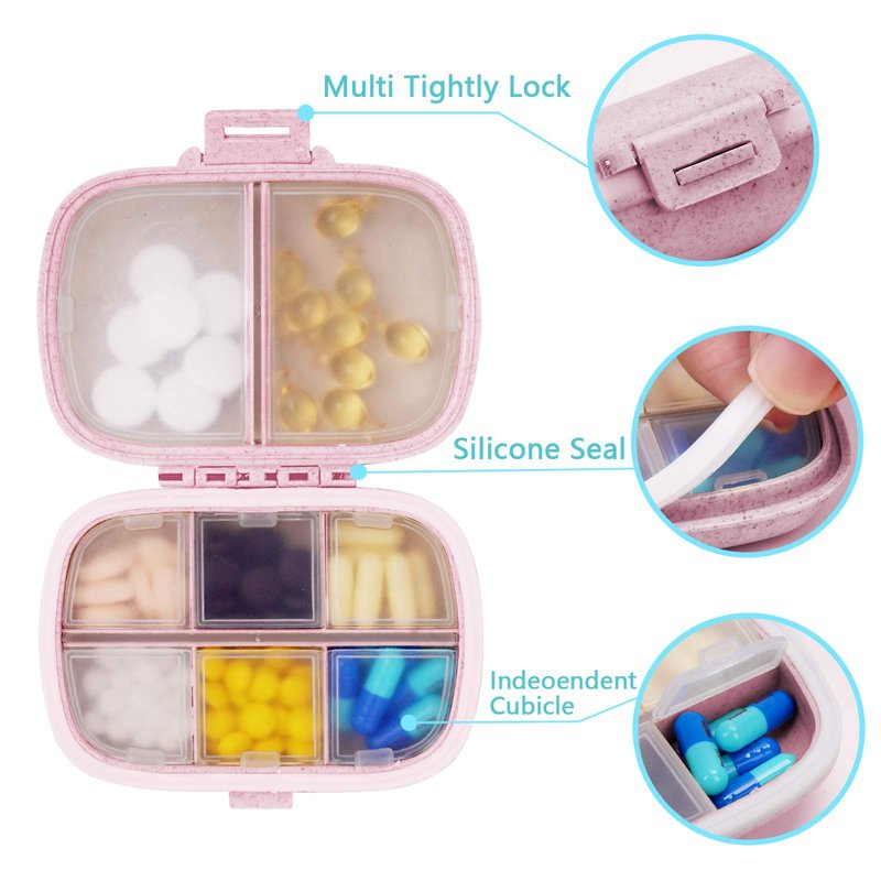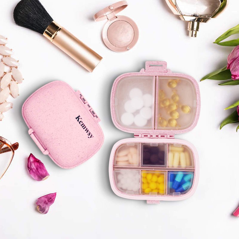 Kcmwsy Travel Pill Organizer Small Pill Box Portable Daily 8 Compartment Pill Case for Purse Pocket Medicine Vitamin Holder Container(Wheat Pink)