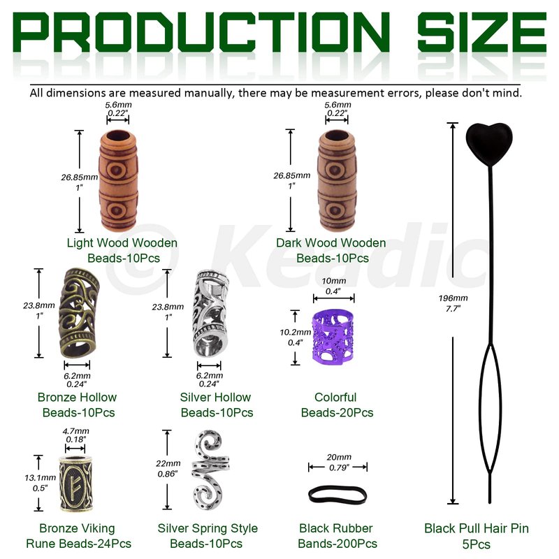 Keadic 299 Pcs 7 Style Viking Hair Beard Bead Assortment Kit Includes Dreadlocks Beads, Pull Hair Pin, Black Rubber Bands and Hair Extension Link Ring for Hair Braiding DIY Jewelry Decoration Package Include: 10 pcs-----silver viking dreadlocks beads 24 pcs-----bronze viking dreadlocks beads 20 pcs-----imitation wood dreadlocks beads 5 pcs-----pull hair pin 10 pcs----- Spring Shape Hair Coil 20 pcs-----colorful dreadlocks beads 200pcs-----black rubber bands Totally 254pcs, coming with a free storage bag How to Use; Firstly find the position of the viking beard beads and place your hair in the round hole of the threading tool. Secondly insert the tip of the pull hair pin into the hole of the beard bead. Thirdly gently pull the end of the hair through the bead and pin it on your hair. Now you get fascinating hairstyle!!! Widely Application:Not only decorate besides hair, braid, beard, dreadlock, pirate, medieval ponytails,braid hair beads, but also as creative jewelry findings to make DIY pendants,bracelets and necklaces and more. Occasions: wedding, birthday, music festival, ceremonies, graduation, cosplay, party and more. Best gift for men and women
