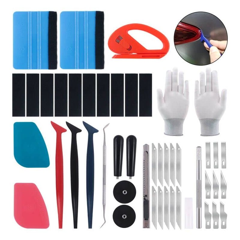 - 💚〖1. Starter Kit〗In this car wrap vinyl vehicle film tool kit, you will get almost everthing you need to start an auto window tinting and wrapping project: 2pcs 4" blue vinyl wrap felt squeegees with 10pcs spare fabric felts, 2pcs vinyl graphic magnet holders, 1 pair of white gloves, 1pcs orange zippy vinyl cutter, 2pcs different utility knives and 20pcs blades, 2pcs scrapers soft and hard, 4pcs micro squeegees and a sturdy concealed box.