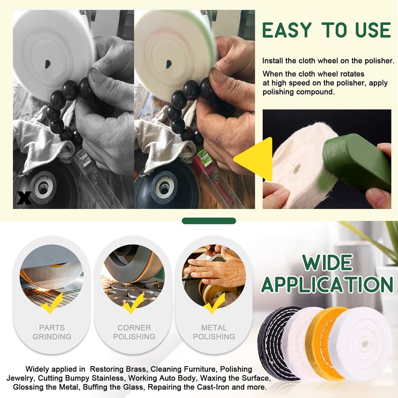 - 【What you Get】The 4 inches polishing buffing kit with polishing compound set contains 1pcs denim wheel, 1 pcs 30 Pcs Flannel wheel, 1 pcs (36 ply) yellow wheel, 1 pcs (50 ply) cotton wheel, 1 pcs brown tripoli, 1 pcs white diamond buffing compound, 1 pcs general green compound, 1 pcs metal shank, totally 8 pcs . All-in One buff wheel compound set is perfect for rough, medium, fine, delicate polishing treatment.