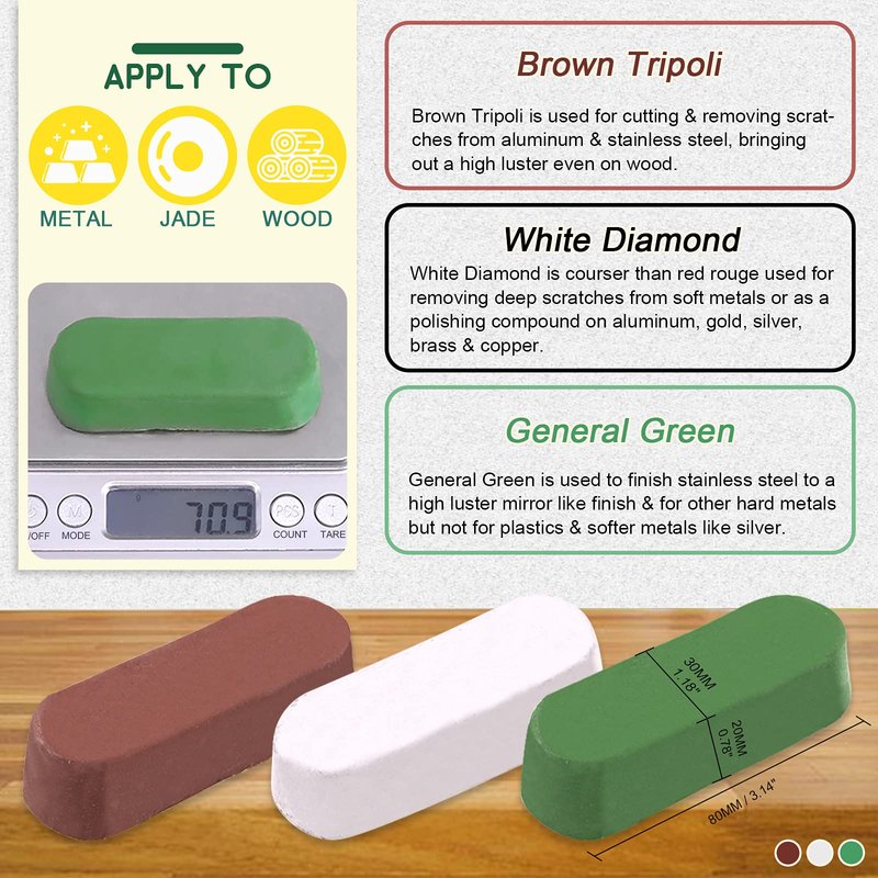 - 【Wide Application】 Ideal for brass, aluminum, bronze, glass, stainless steel, chrome, plastic, cast iron, ect.Perfect for Polishing, Cutting, Waxing, Cleaning, Repairing, Restoring, Reviving etc. Widely applied in Restoring Brass, Cleaning Furniture, Polishing Jewelry, Cutting Bumpy Stainless, Working Auto Body, Waxing the Surface, Glossing the Metal, Buffing the Glass, Repairing the Cast-Iron and more.