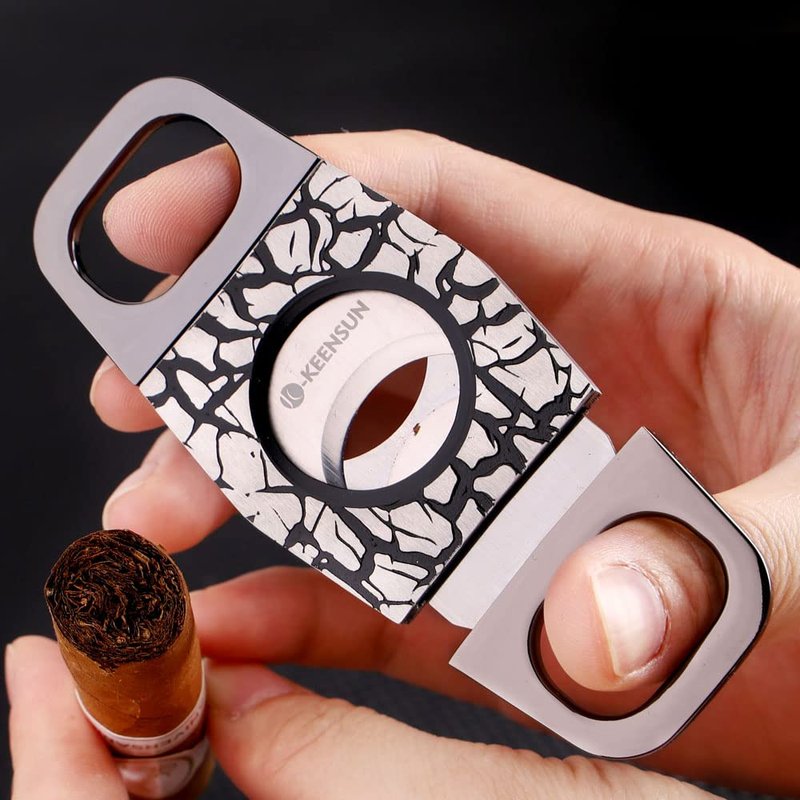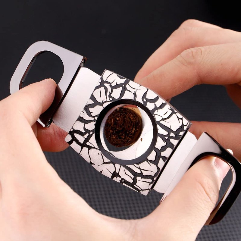 - High Quality: The handle is made of zinc alloy, which is highly slip-resistant and corrosion-resistant. The shell is polished with stainless steel to add crack lines, making the surface of the cigar cutter more distinctive. Dual blades made of 420J2 stainless steel are sharp, hard and rust-resistant. The precisely designed blade angle provides the best depth of cut, cutting cigars effortlessly and smoothly without damaging the cigar cap.