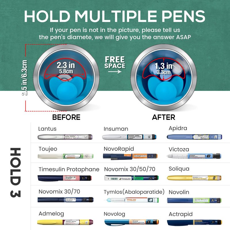 - 【HIGH CAPACITY/COMPACT】-->Portable cooler for medicine travel with internal free space of 1.3in(33mm )can be successfully fitted with 3 insulin pens/needles with a diameter of 0.6in(15mm).The same is true for Humira/Ozempic/Tacticy/Lantus/Saxena/Victoza/Juvederm etc. Please refer to the available space or consult the technical support team of KEKHEALTH