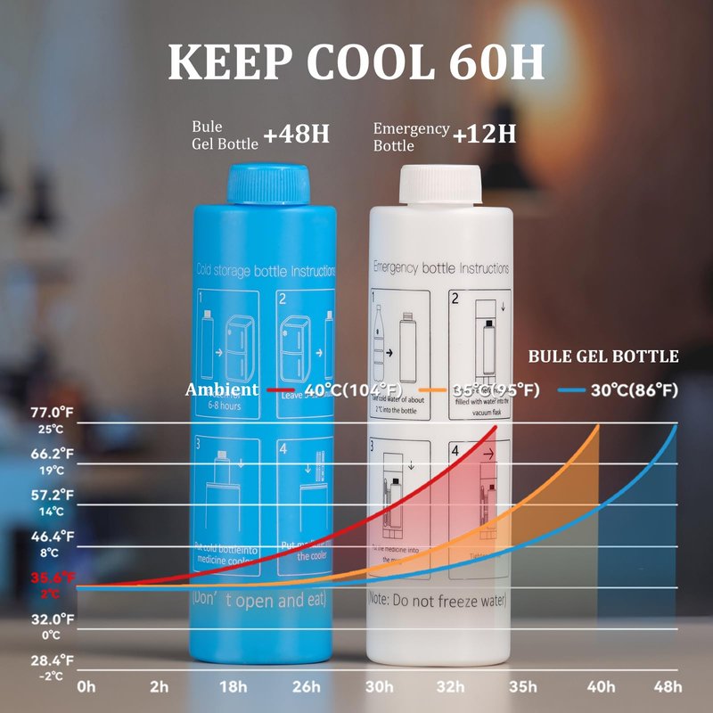 - ENHANCED COOLING PERFORMANCE:1) Durable Construction: Made from robust 18/8 (304) stainless steel with double-layer vacuum insulation, which enhances the convenience and safety of use; 2)Advanced Cooling Technology: COMPACT@ Includes efficient blue gel bottle that maintain insulin at refrigerator temperatures (36-46°F / 2-8°C) for about 25 hours (36-79F for 48H); 3) Extra White Emergency Bottle of ice water can extend the storage time by 12 hours, 36-79F for up to 60H