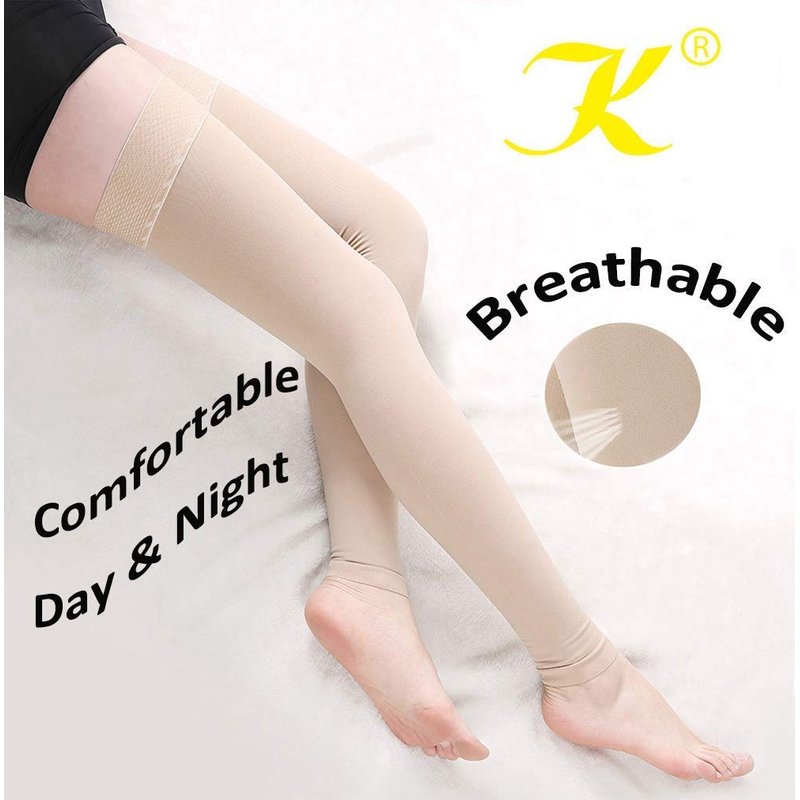KEKING thigh high compression socks have 15-20mmHg and 20-30mmHg grade compression. KEKING compression socks has the following advantages: Provide comfort and support: Thigh compression socks are made of soft medical elastic materials that are suitable for leg curves, provide a comfortable wearing experience from the ankle to the thighs. Improving blood circulation: Thigh compression hose socks help promote blood circulation and increase blood flow back to the heart by applying appropriate pressure. This helps to reduce the risk of lower limb venous thrombosis and improve vascular function. Suitable for those who often stand, sit, or need to walk for long periods of time, such as office workers, service workers, and long-distance travelers. Reducing swelling and edema: The pressure of thigh compression stockings can help alleviate swelling and edema in the legs. They promote fluid flow between tissues by providing moderate pressure, reducing the occurrence of fluid accumulation and swelling. Suitable for people who are prone to leg swelling and edema, such as pregnant women, varicose vein patients, and long-term bedridden individuals. Relieve pain and discomfort: compression socks can alleviate symptoms of leg pain and discomfort. Their pressure can alleviate pain caused by vascular dilation and inflammation, provide support and stability, and reduce muscle fatigue and soreness. Suitable for people who often experience leg pain, soreness, or fatigue, such as those who work for long periods of time while standing, athletes, and the elderly. Preventing venous thrombosis: Full leg support socks can help prevent deep vein thrombosis in the lower limbs. By providing appropriate pressure, they can promote blood flow and prevent blood from accumulating and clotting in the veins. Suitable for those who need to sit or stay in bed for a long time, such as postoperative patients, those who spend a long time on airplanes, and patients who stay in bed for a long time.