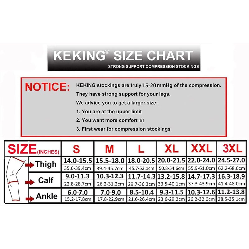 - ✅ 💃【EFFECTIVE COMPRESSION AND RELIEF】- KEKING 15-20 mmHg Graduated Compression stockings give you optimal pressure where your body needs it most, that is strongest at the ankle and gradually diminishes as it goes up the leg. By improving blood flow & circulation can reduce muscle cramping while re-energizing tired legs and effectively solve the problem of inflammation of the legs and feet. Helps relieve swelling, varicose veins, sore aching muscles, edema, DVT blood clots.