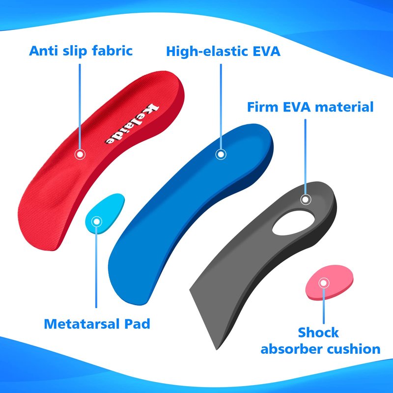 - 👣PREMIUM QUALITY👣 Kelaide arch support inserts apply durable top graded EVA sole with extra shock absorber heel cushion, sweat-wicking breathable top layer made of wear-resistant anti-skid microfiber. Longer service time, fewer odors