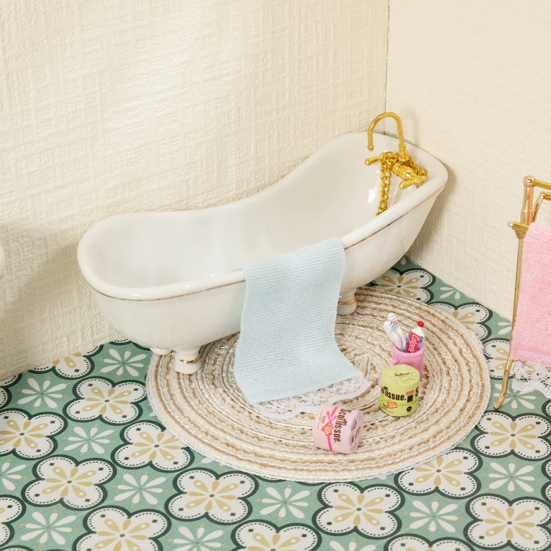 - EXQUISITE CRAFTSMANSHIP: The bathtub, toilet and sink are made of ceramic, which is very smooth and strong. The cute carpet is hand woven and very soft. Toothbrush, toothpaste and cup can be separated. The toilet seat can be opened and closed. You can also see yourself in the mirror.