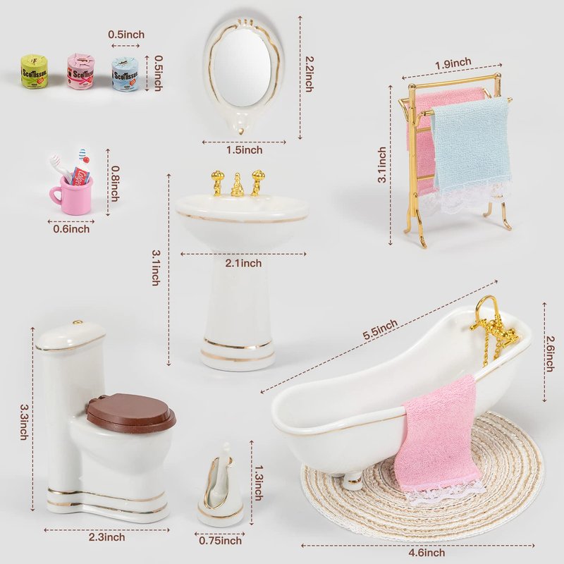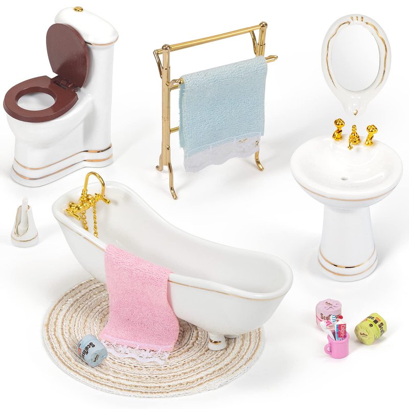 Keldoner Ceramic Dollhouse Furniture 1 12 Scale, Doll House Furniture Toys for Dollhouse Bathroom Incl Toilet Bathtub Washbasin Towel Rack and Other Miniture House Furniture and Accessories