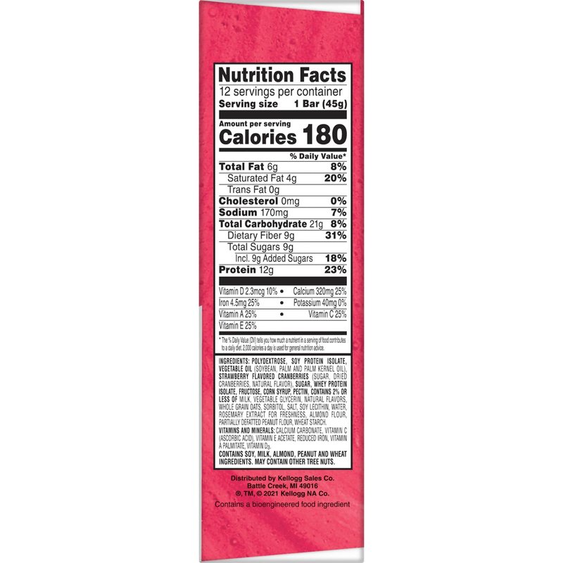 - 12g protein (23% daily value); Contains soy, milk, almond, peanut, and wheat ingredients; May contain other tree nuts