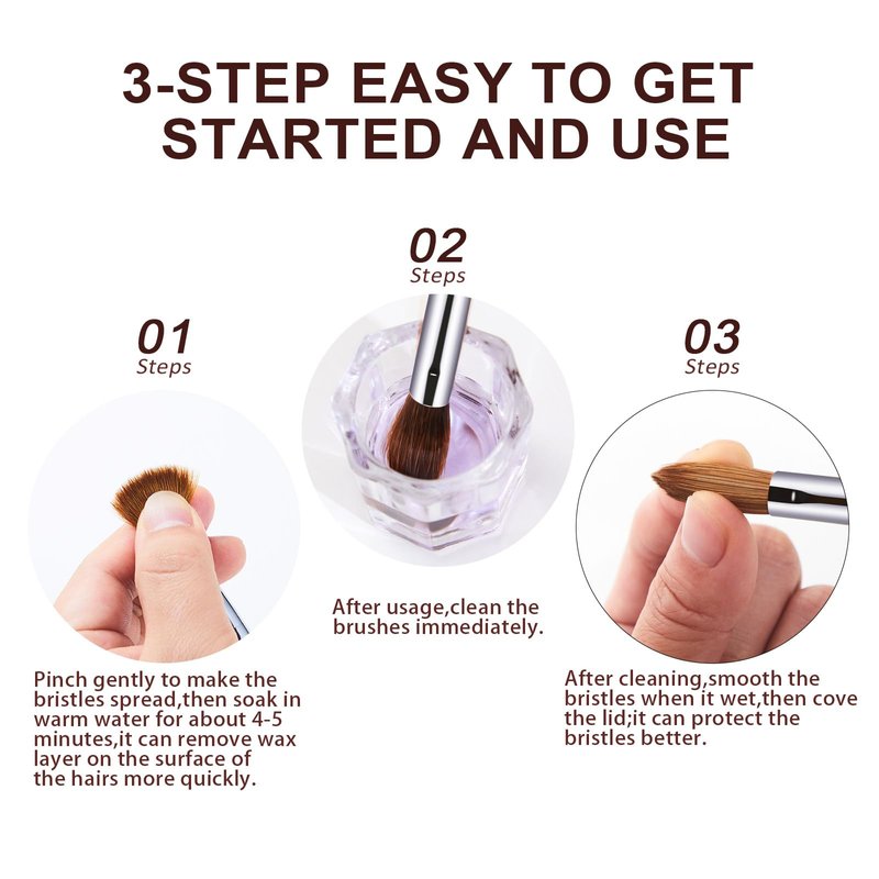 - 【Clean and Storage】After every application on single nail, make sure to clean the acrylic brush with brush cleaner to prevent the acrylic powder from clumping.Do not use acetone, it will remove the shine, make acrylic tacky and buildup residue. After cleaning, remove moisture with a paper towel, reshape, and keep it in the upright position.
