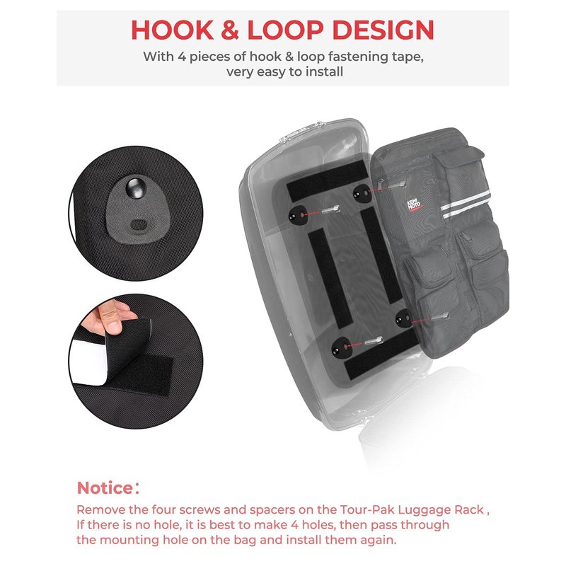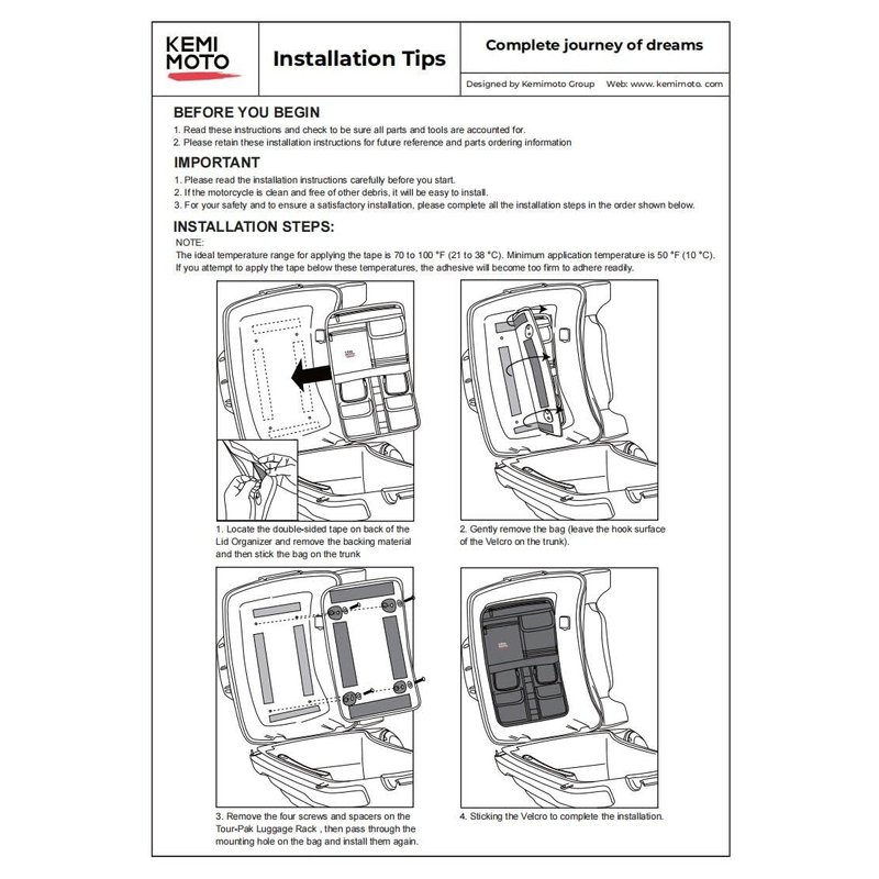- Removable and Portable - With hook-and-loop fastener tape install way, this Tour-Pak Lid Organizer can be taken apart when you need to take away your items.