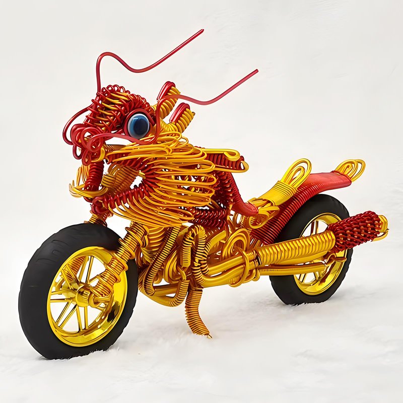 This handcrafted aluminum wire motorcycle model is a captivating piece of art that will add a touch of whimsy to any space. Meticulously crafted by skilled artisans, each detail is brought to life with vibrant red and golden hues. The lifelike dragon head is a standout feature, showcasing the intricate workmanship. Perfect as a festive gift or a unique office decoration, this one-of-a-kind sculpture is sure to be a conversation starter. Please note that due to the nature of the materials, the wires may have sharp edges, so adult supervision is recommended for children under 12. Display it proudly on a glass shelf or tabletop for a striking visual impact.