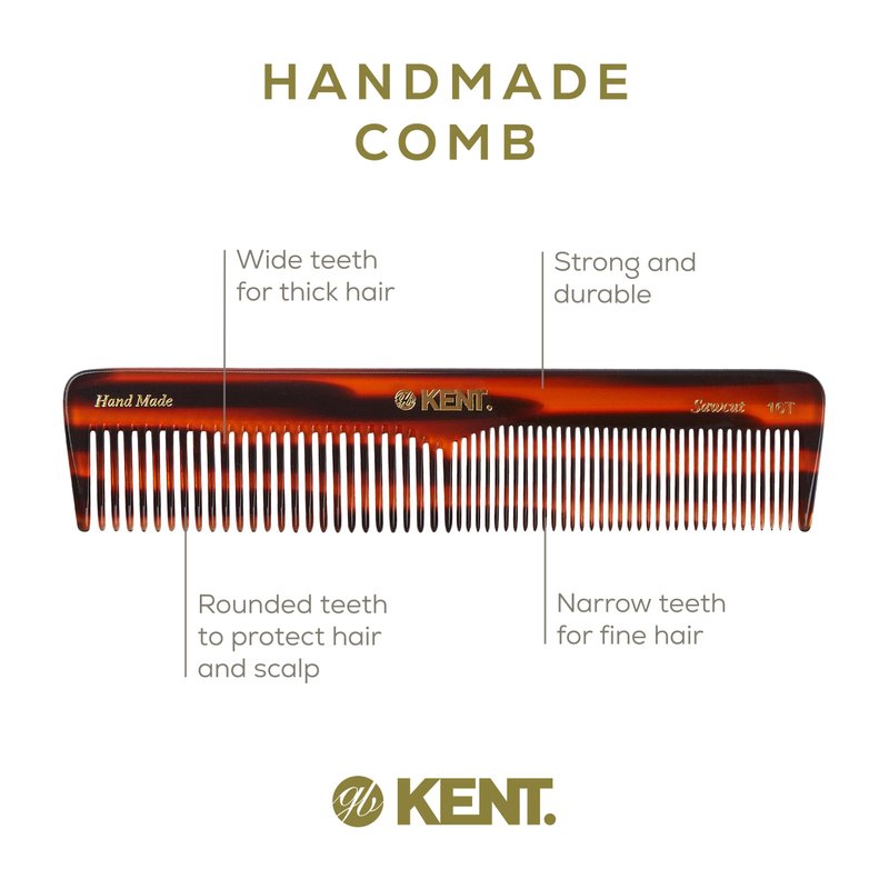 16T Dresser Comb: 7.2 Inch Large Tortoise Shell finish. ABOUT KENT'S HANDMADE COMBS: Kent Handmade Combs for Men and Women Range are of excellent quality. Kent hand sawn combs are cut from large sheets of cellulose acetate rather than moulded, producing a truly gentle comb whereas moulded combs often snag and damage the hair. This material is tactile, flexible and strong. They glide effortlessly through hair without scratching to damaging the hair or scalp. Kent combs have rounded teeth which ensure a smooth and comfortable action. The range includes designs for thick and fine hair, in varying sizes, for both men and women. About Kent: Founded in 1777, Kent Brushes is the world's oldest hairbrush manufacturer and has maintained its British traditions of producing the world's finest hairbrushes and combs ever since. Making the best quality brushes for over 230 years and creating over 250 products. Quality, design and attention to detail go into each brush. They have been the holders of The Royal Warrant through the last nine consecutive reigns of British monarchy. The company continues to retain the craftsmanship and unprecedented quality that is Kent's reputation.Even in today's fast moving, mass-produced assembly lines, they are proud to still be manufacturing many of their original brushes by hand.