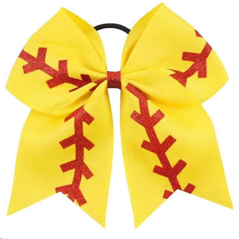 Kenz Laurenz Softball Bow Gifts - for Girls Team Yellow Red Stitching Ribbon to Match Bag Socks Pants Cheer Ponytail Holder Cheerleading Cheap Hair Bow Blanks to Custom (Softball Bow 1)