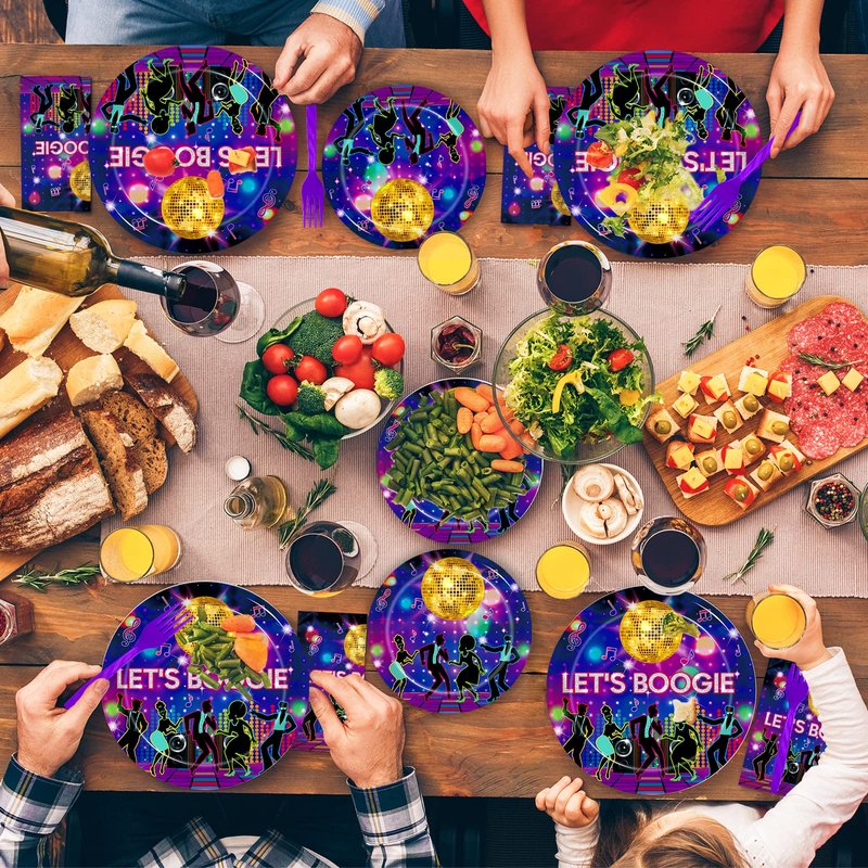 - Complete 70s Party Decoration Set: Our 70s theme party tableware set includes everything you need for a party of 24 guests - 24 70s party paper dinner plates (9''), 24 70s paper dessert plates (7''), 24 70s napkins (13''), and 24 forks (6.5''). Perfect for hosting your party with ease