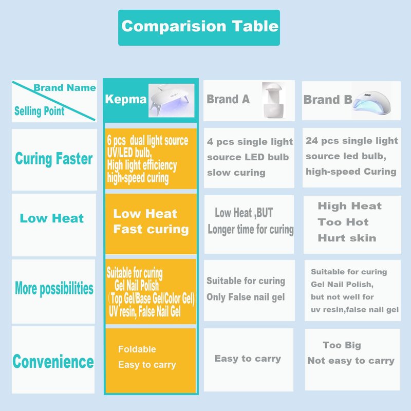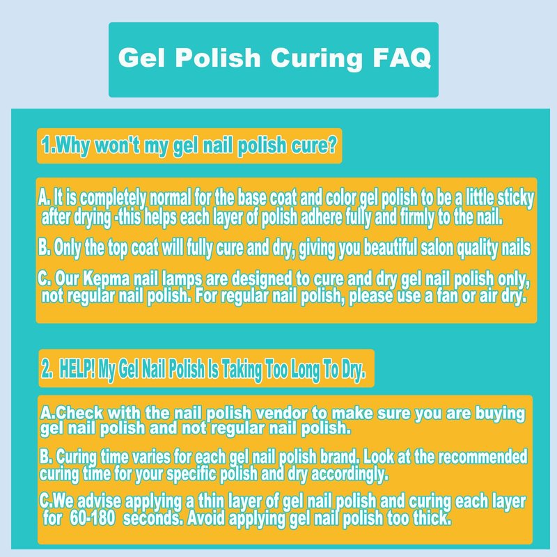 - 5.【Warranty】100% customer satisfaction is our pursuit, we can provide 12 months warranty.Warm Tips:Please notice the lamp size before placing an order . It is normal for gel nail polish to feel sticky after curing.DO NOT WIPE. It is recommended to apply as thin a coat as possible when applying gel nail polish. The curing time will be shorter.