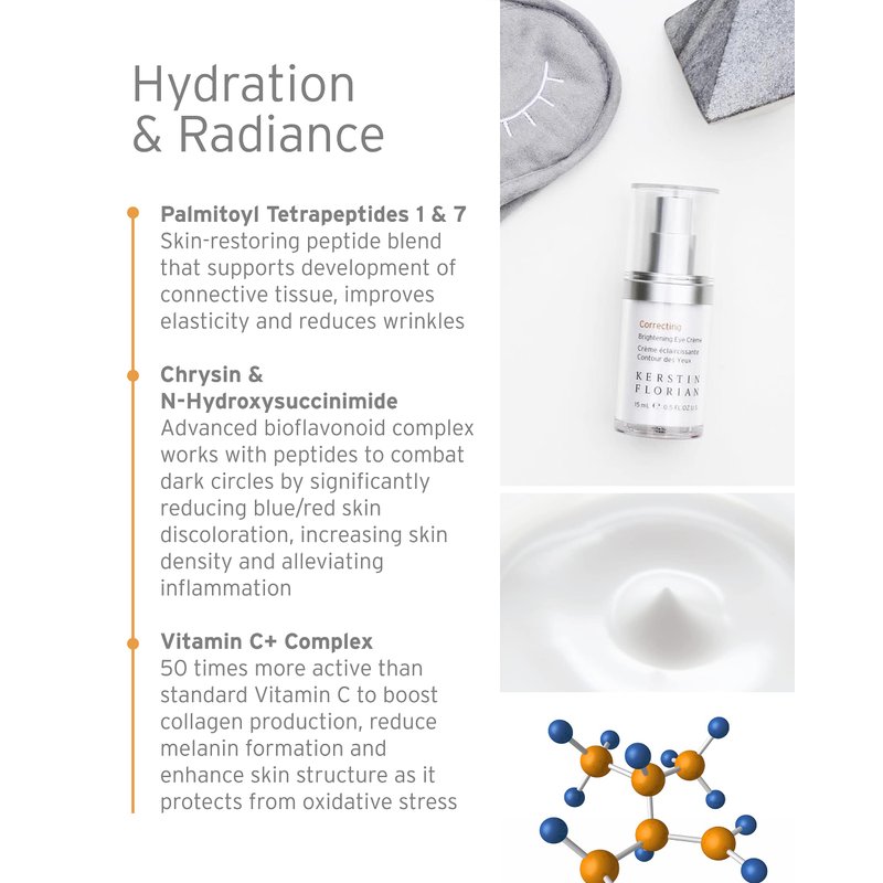 Kerstin Florian Correcting Brightening Eye Creme visibly defies the top concerns of aging eyes – expression lines, dark circles and puffiness. With just one use, the eye area is instantly more hydrated, brighter and smoother. Its powerful, advanced active ingredients also offer long-term, clinically-proven results: 19% reduction in dark circles and 45% improvement in wrinkle depth in two months of use.