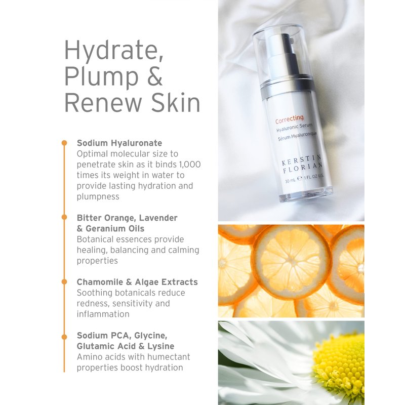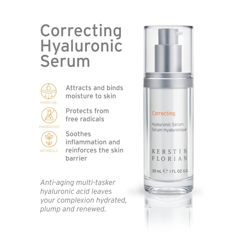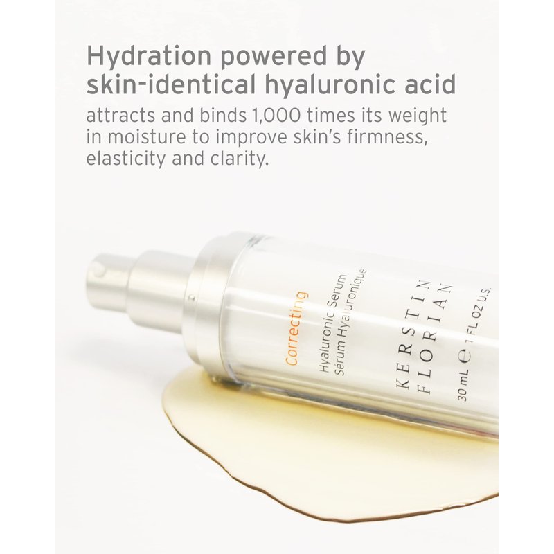 Top-selling Kerstin Florian Hyaluronic Serum weightlessly quenches complexion with skin-identical hyaluronic acid able to attract and hold 1000 times its weight in moisture to skin. This replenishment reinforces the skin barrier and enables it to fend off environmental damage, allowing skin to function at its most optimal level. Skin is left hydrated, smooth, plump and revitalized.