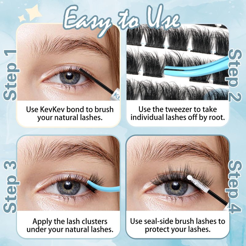 - Four kinds of lash tools: KEV waterproof bond and seal can strong hold the lash clusters till 72 hours. Lash Remover can Easily removes eye makeup residue without irritating your skin. Eyelash tweezer and lash brushe can help finish your eyelash look!