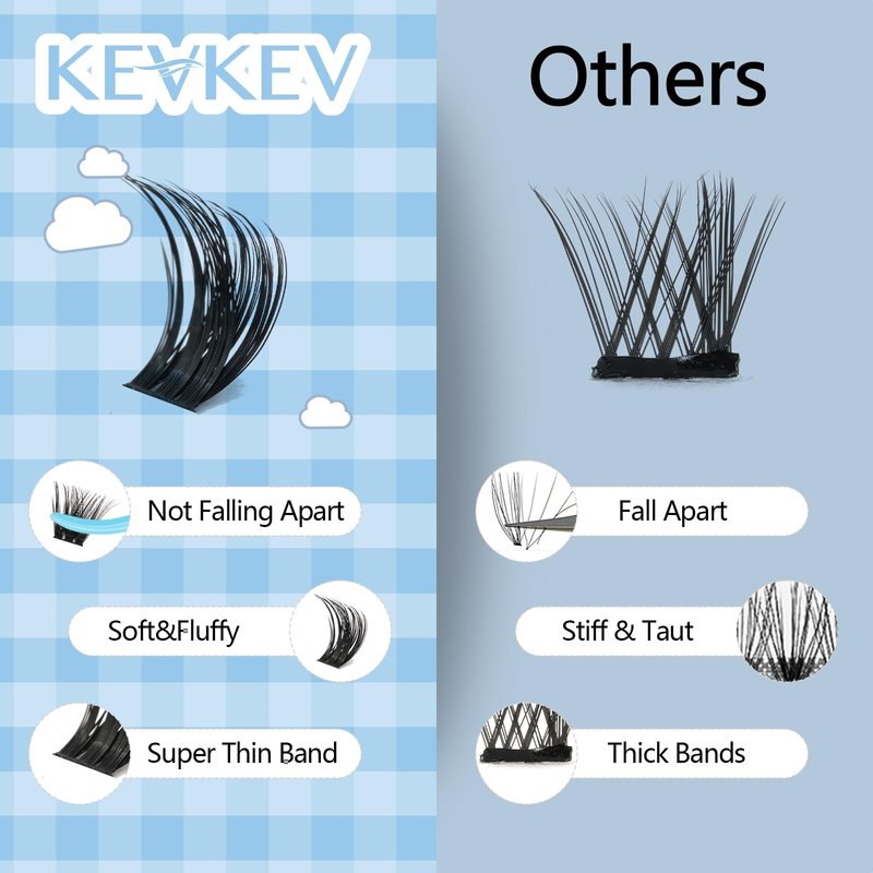 - At Home Lash Extension: KevKev lash clusters suitable for lash novices and experts. You can apply cluster lashes yourself at home to complete your lash make up, without the need to go to a eyelash salon, saving you money and hassle.