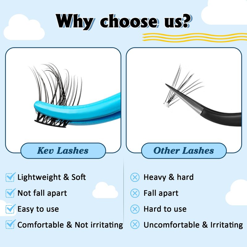- Soft & Lightweight: Super thin band lash clusters to ensure the lashes will not hurt your eyes. Also we have upgraded our eyelash materials. Our cluster lashes are soft and fluffy just like natural lashes. No worry about the plastic look.