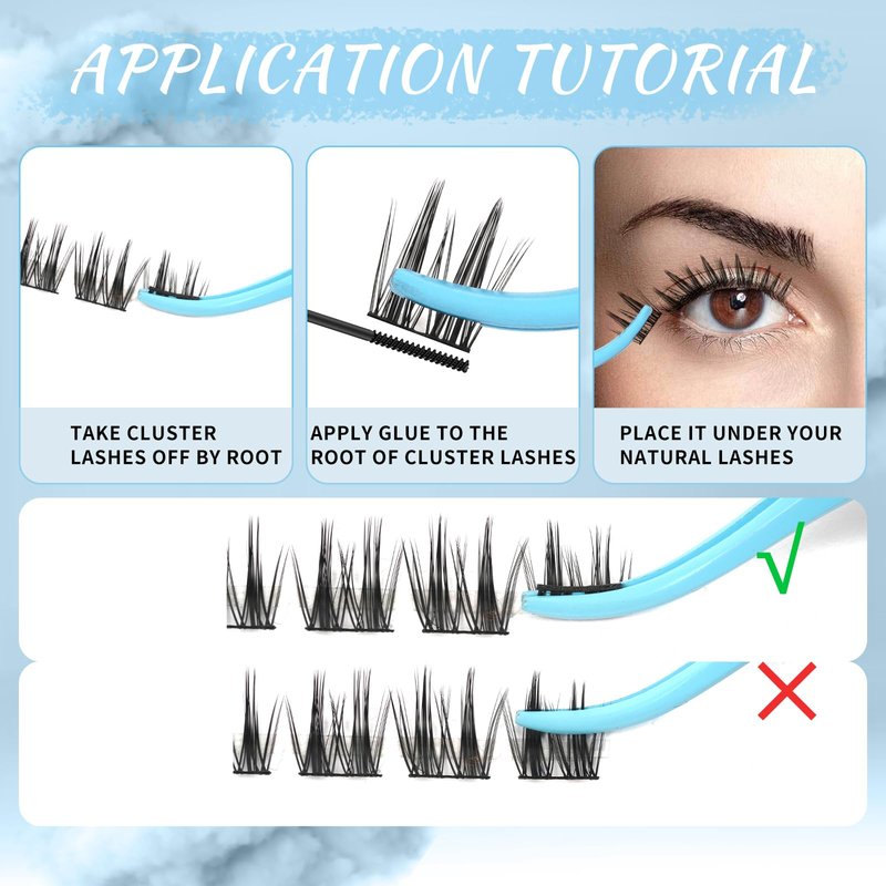 - How to apply lash clusters: 1. Apply the cluster lash glue to your natural lashes and wait about 30 seconds. 2.Gently take lashes off the strip by grab them at the root. 3.Then apply the cluster lashes underneath your natural eyelashes, away 2-3mm from your eyelid.