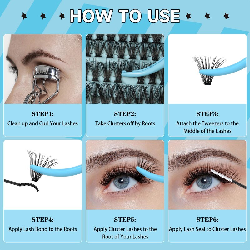 - How To Use: STEP 1: Clean and dry your eyes, then curl your lashes. STEP 2: Take lash clusters at the band, mix and match the lashes into your favorite look! STEP 3: USE the lash bond onto your natural lashes, keeping 1-2mm away from your eyelid. STEP 4: Apply the lash clusters and apply lash seal to protect your lashes.