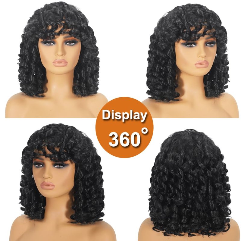 • 1.Short Curly Wigs With Bangs: This short curly wigs for black women is natural cute and not too shiny. The loose curly wig with bangs mix with several kinds of high temperature resistant synthetic fibers, no smell, tangle less, no fake, looks very natural and realistic wigs with curls bangs. Afro wigs for black women.