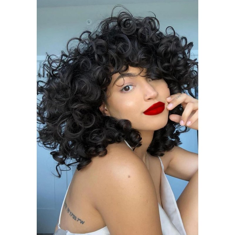 • 3.Black Afro Loose Curly Wigs for Black Women Widely Use: This black wig looks real and soft touch.Short curly wigs with bangs usually has longer length, that you can cut as the style your like. Medium length curly wigs with bangs for black women can help you to make a prefect look for daily, wig party, dance, cosplay, custom. Shot black curly wig really nice for your busy lifestyle.