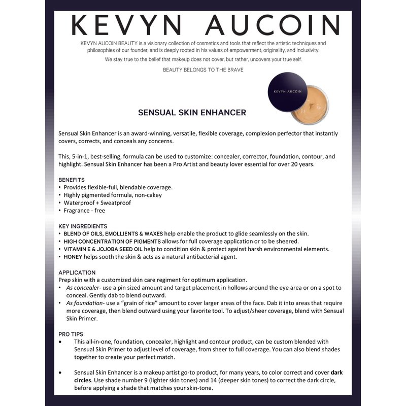 - The Kevyn Aucoin SENSUAL SKIN ENHANCER is our iconic, award-winning, and best-selling multi-use complexion perfector designed to enhance your complexion and features with a flexible, high coverage and natural finish. Use it as your foundation, spot concealer, color corrector, contour or highlight. A versatile perfector that instantly covers and conceals concerns like a magic eraser. Available in 16 Shades & housed in a modern clear package, i.e., a makeup artist pro-perfect for finding shades.