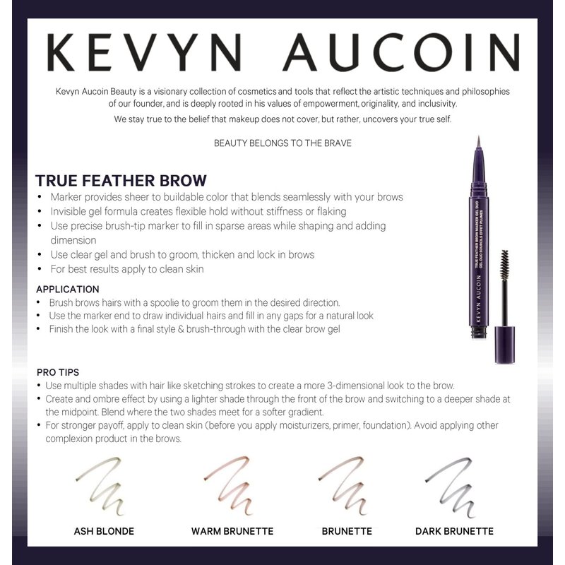 - Kevyn Aucoin True Feather Brow Marker Gel Duo: This innovative dual-ended marker shapes, defines, and sets brows for a full, natural finish. The precision brush tip creates subtle hair-like strokes while the invisible gel sets brow hairs in place. Available in 4 colors … Ash Blonde, Brunette, Dark Brunette, and Warm Brunette.