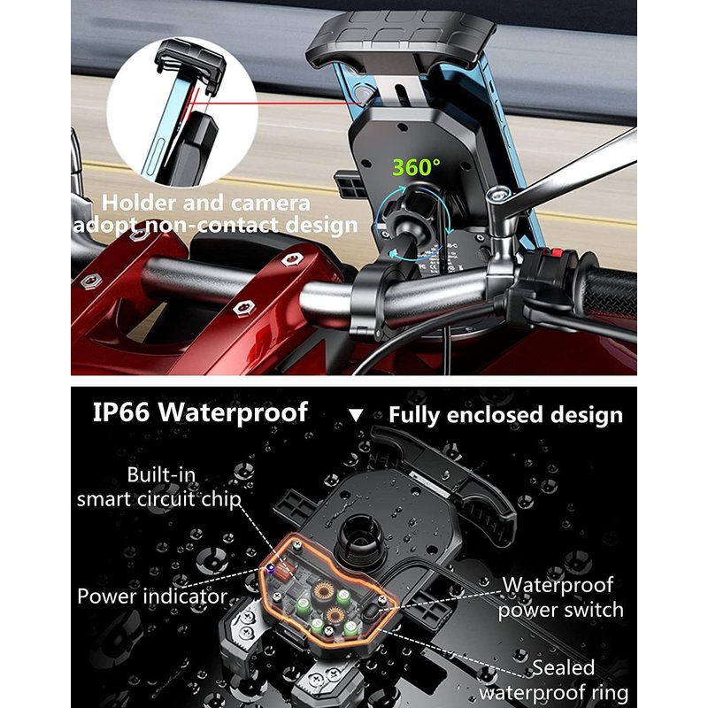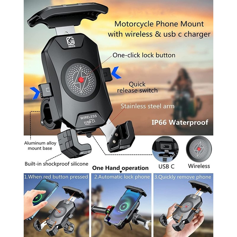 - ▶This motorcycle phone mount with wireless and USB C dual charger: When connect to motorcycle battery as input, both wireless & USB C charger work well. Support simultaneous fast charging of two compatible digital devices. The motorcycle phone holder wireless output 15W max, USB C output 20W max.