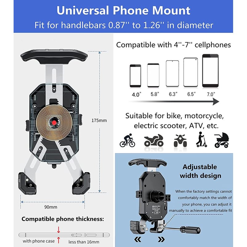 - ▶Wide Compatibility: The motorcycle phone holder fit for 4'' to 7'' cellphones. Compatible with mobile phone thickness less than 16mm.The motorcycle phone mount handlebar mounting base fit for handlebars 0.87''(22mm) / 1.0''(25.4mm) / 1.26'' (32mm) in diameter. Suitable for installation on motorcycle, electric scooter, ATV, etc. Accommodates handlebars 0.87" to 1.26" in diameter.