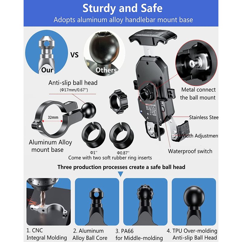 - ▶IP66 Waterproof: The internal circuit of the motorcycle phone mount adopts fully enclosed design. Equipped with a waterproof power switch and power indicator. The USB C port has a protective cover, waterproof and dust-proof. Ensure the safety of the holder even riding on rainy days.