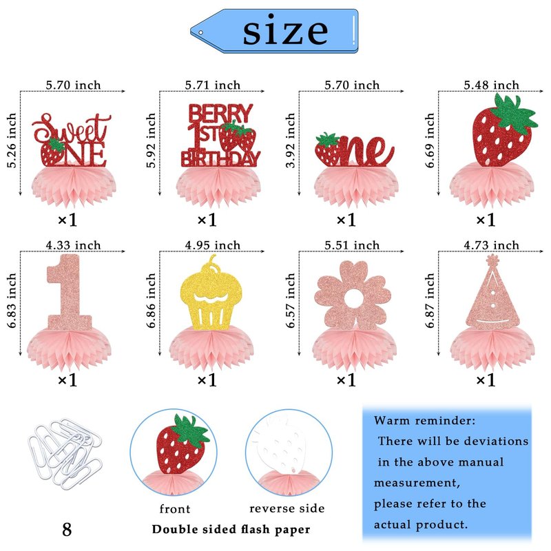 - Package Include: 8Pcs Berry 1st Birthday Centerpiece Honeycomb. Perfect for Kids Birthday Party! Unique design makes your party full of atmosphere. They will make your food remarkable and attract.