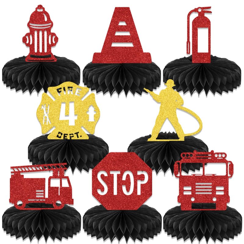 - Package Include: 8Pcs Firefighter Honeycomb Centerpiece. Perfect for Birthday Party! Unique design makes your party full of atmosphere. They will make your food remarkable and attract.
