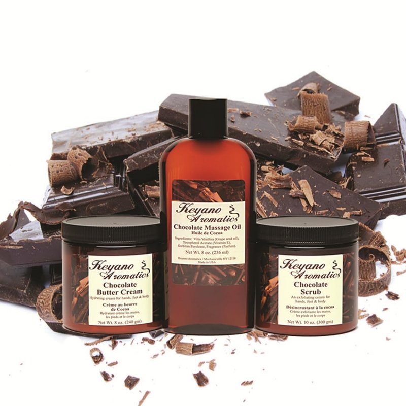 Chocolate Kit Includes: 1-Chocolate Scrub - 10 oz. 1-Chocolate Butter Cream - 8 oz. 1-Chocolate Chocolate Massage Oil 8 oz. Chocolate Chocolate Massage Oil - A cuvee of grape seed oils scented with our Chocolate used for massage and as a component of our Chocolate Spa Treatments. Chocolate Butter Cream - A fat-free hydrating indulgence for the hands, feet, and body with 20% Shea Butter, Grapeseed Oil, vitamins A, C, and D, and natural food-grade preservatives. Chocolate Scrub - An exfoliating treatment formulated with Shea Butter for the hands, feet, and body.