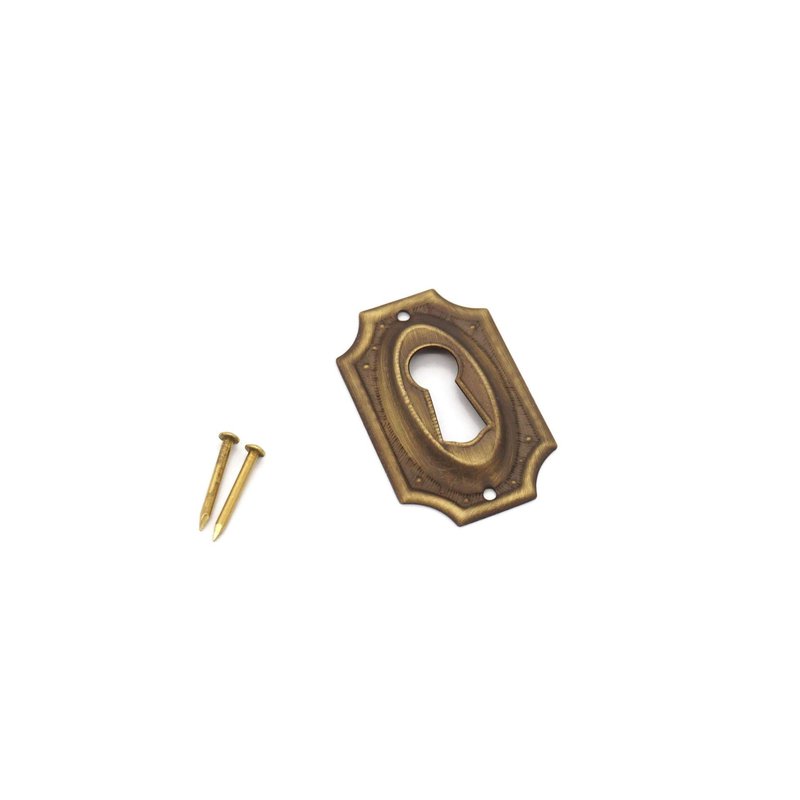 This keyhole cover, escutcheon is an excellent choice for your Sheraton Style and Early American furniture and modern cabinets where a lock is used. Stamped from sheets of brass, this escutcheon is thin and can be be bent slightly to the contours of the furniture if necessary. Features a decorative floral accent with an antique finish. Comes with 2 solid brass brads/nails.