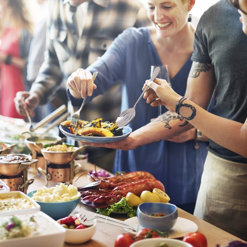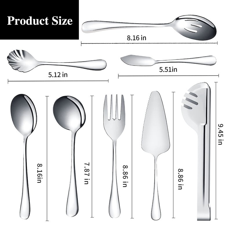This set of serving utensils is made of food-grade stainless steel, which is healthy, harmless, rust-proof and sturdy. With a wide variety, it can almost meet the needs of daily life and parties, allowing you to enjoy the fun of food with friends or family.