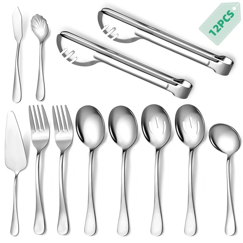 - 【 Serving Utensils Set of 12】In this pretty serving utensils set you will get 2 serving tongs, 2 slotted serving spoons, 2 serving spoons, 2 serving forks, 1 soup ladle, 1 pie server, 1 butter knife,1 sugar spoon.