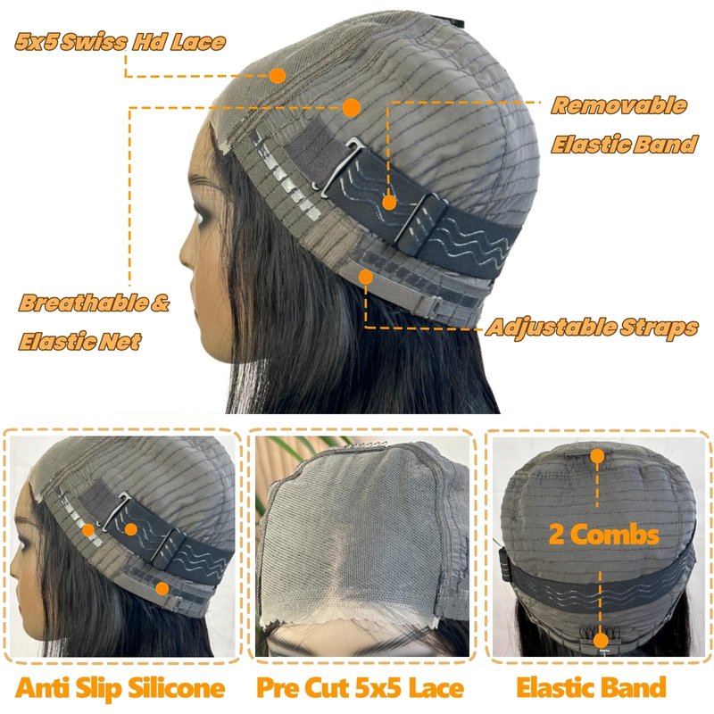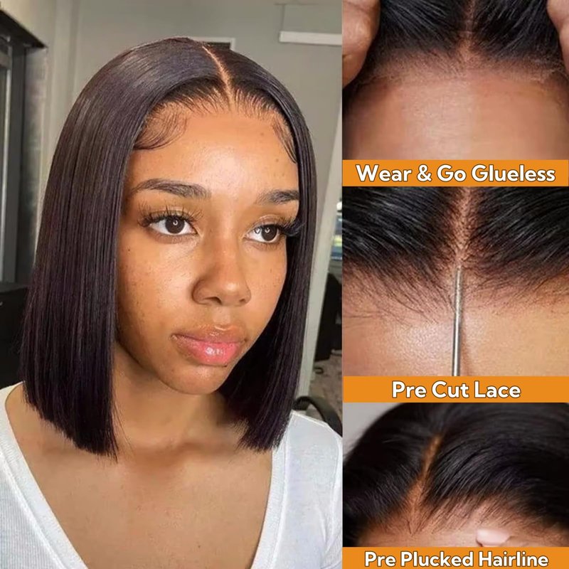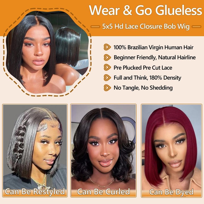 - Wear and Go Glueless Bob Wig Advantage: Pre plucked pre cut 5x5 Hd lace closure bob wig. Ready to go, save time and money, no glue required, you can put it within 30s without any skills, super friendly for beginners